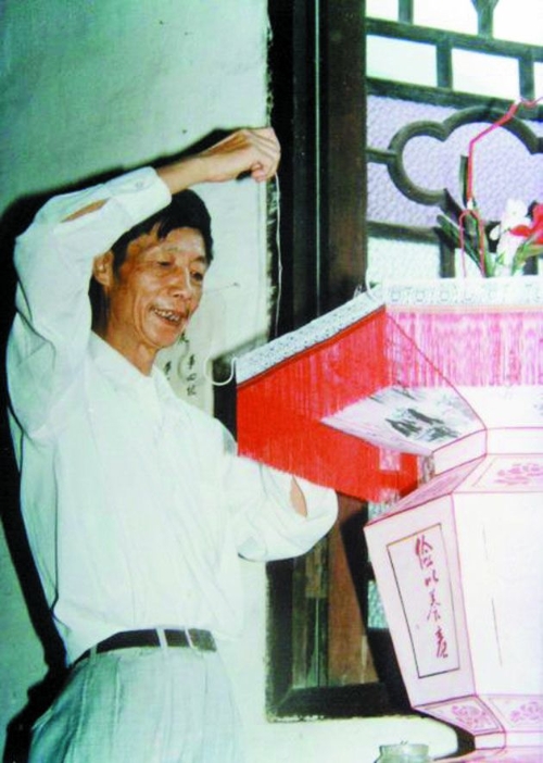 一见钟情 1959年,沈祖生还是海宁的一名银行职工,兼任业余图书宣传,被抽调到农业局做展览布置。其间,结识了海宁百货美工吴玉容,两人为书画知音,经常切磋技艺。 1961年的一天,吴玉容陪同沈祖生去硖石沙泗浜一户姓邱的大户人家串门。进去后,见厅堂上挂着四盏宫灯,古色古香、气势非凡。沈祖生被这四盏硖石灯彩深深地吸引住了。大家见状,就建议他去拜访硖石知名扎灯艺人孙惟君。 来到孙家,只见孙惟君先生扎的花灯做工细致,灯上糊的仕女图玲珑曼妙。再加上海宁特有的花灯特色“针刺”,灯光从千孔万眼里透出来,甚是流光溢彩。那一刻,这个花灯印入了沈祖生的心灵深处。 沈祖生认真地向孙惟君先生讨教花灯制作技艺。孙惟君被沈祖生的勤学好问打动,就一五一十地讲解起硖石灯彩来:硖石灯彩,先灯后彩、以灯托彩,只有在灯光的照耀下,才能释放出她全部的魅力。做灯彩并不简单,先用铁丝做支架,将连接点用胶带固定,然后在做好的支架上糊一层宣纸,再涂上一层糨糊,最后糊刻好图案…… 回家后,沈祖生突发奇想,自己刚刚结婚,如果做一个灯彩来装饰新家,岂不很有意思?沈祖生按照孙先生说的步骤,动手做了一盏台灯,让新娘喜笑颜开。一盏小小台灯,照亮了小夫妻美好的生活。之后,银行里工作繁忙,没有空闲制作灯彩,可是制灯的愿望如同一粒种子藏在沈祖生心里。